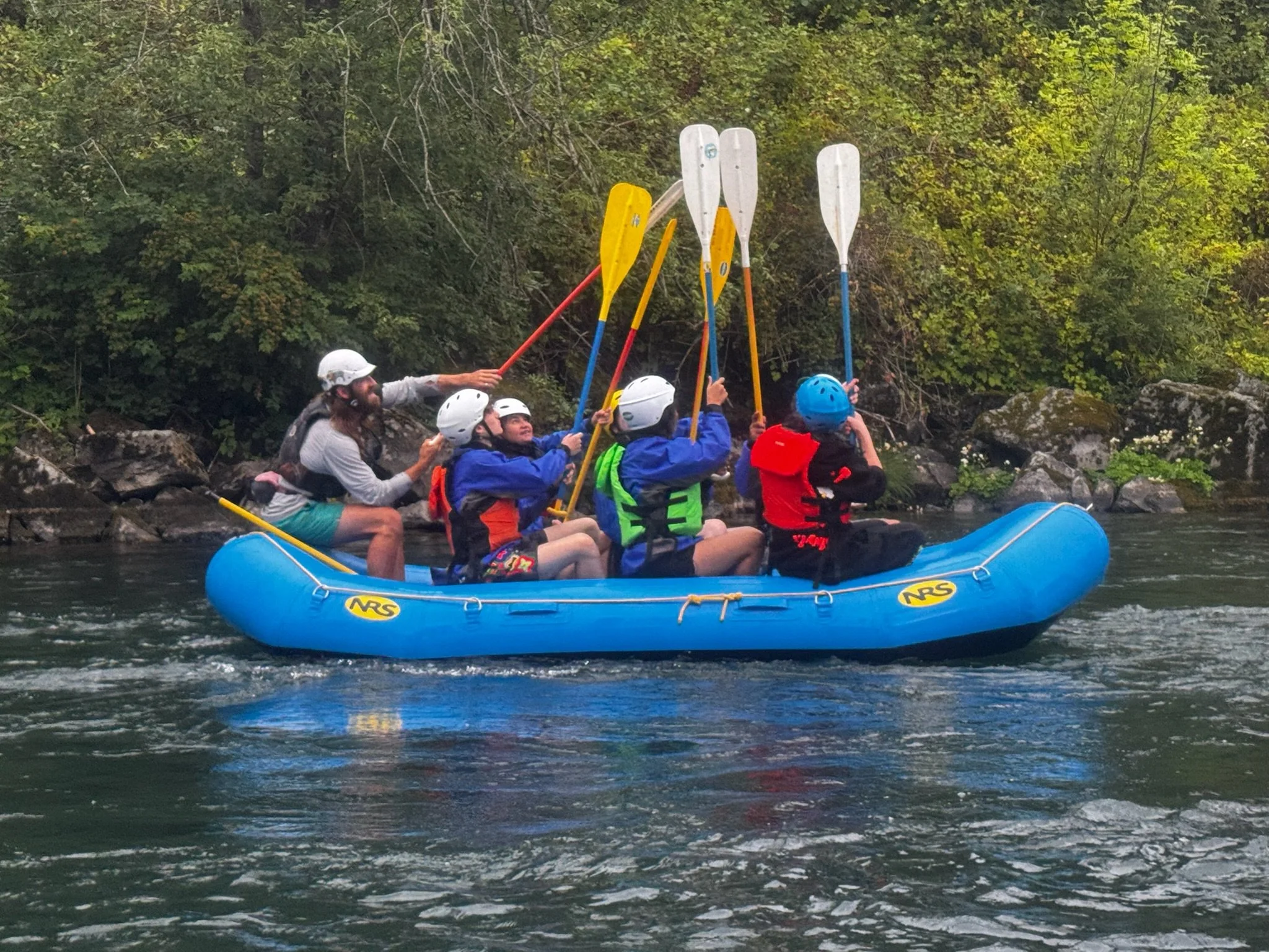 • Bottom center: A group of kids and adults wearing life jackets and helmets, smiling while paddling a blue raft down a river.